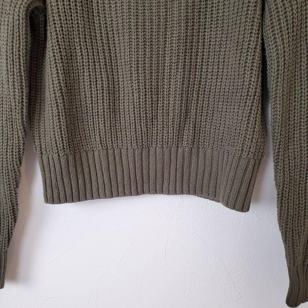 【商品データ】 サイズ:XS カラー:グリーン カーキ 緑 身幅:45cm 着丈:47cm 袖丈:57cm 肩幅:36cm4 【商品説明】 ゆったりした首元で小顔効果大! 丈短めなのでハイウエストジーンズ(デニム)との相性が◎ 今の時期から春まで長く着れます。