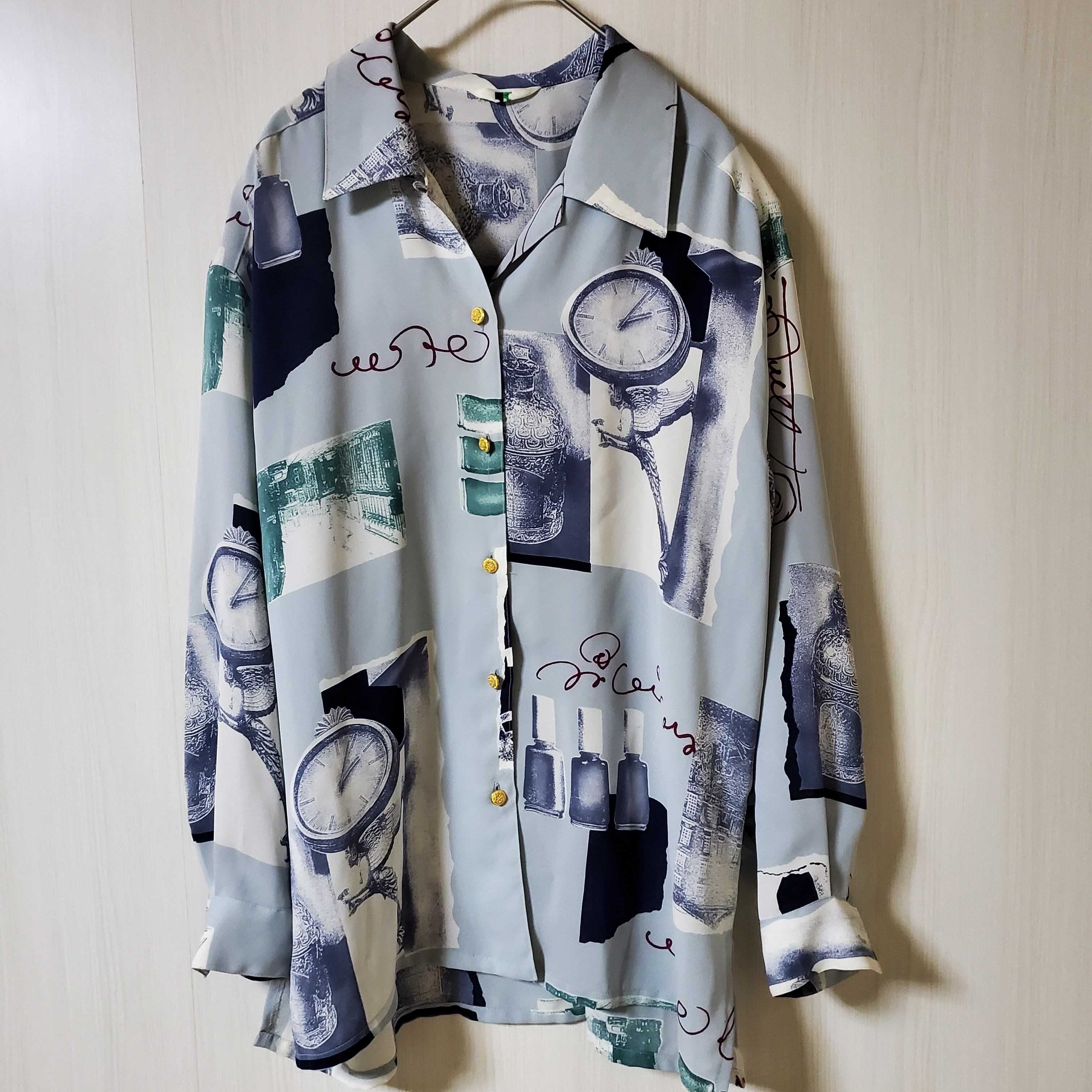 【商品データ】 サイズ:記載なし カラー:ブルー 水色 身幅:53cm 着丈:64cm 袖丈:52cm 肩幅:50cm 【商品説明】 個性的な昭和シャツです。 水色がさわやかで春から秋まで気持ちよく着れます。 ポリエステル100% 柔らかく、サラッとした着心地です。 ボタンはゴールド。