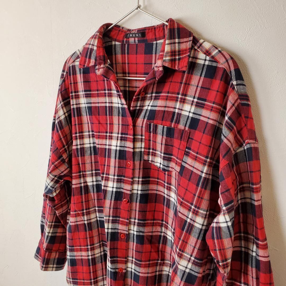 【商品データ】 サイズ:M カラー:赤 ネルシャツ 身幅:50㎝ 着丈:59㎝ 袖丈:64㎝ 【商品説明】 イングの赤のネルシャツです。 この時期、毎年大人気のネルシャツ! あたたかい生地なので冬でもあたたかく着れます。 冬らしい赤色がオススメ! 後ろの文字はCOURAGEと書かれています。